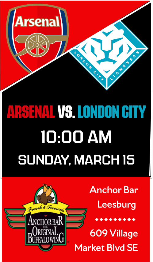 Once again Anchor Bar Leesburg is hosting our Watch Party as the Arsenal Women square off against the Lionesses of London City in a key Super League match up.
