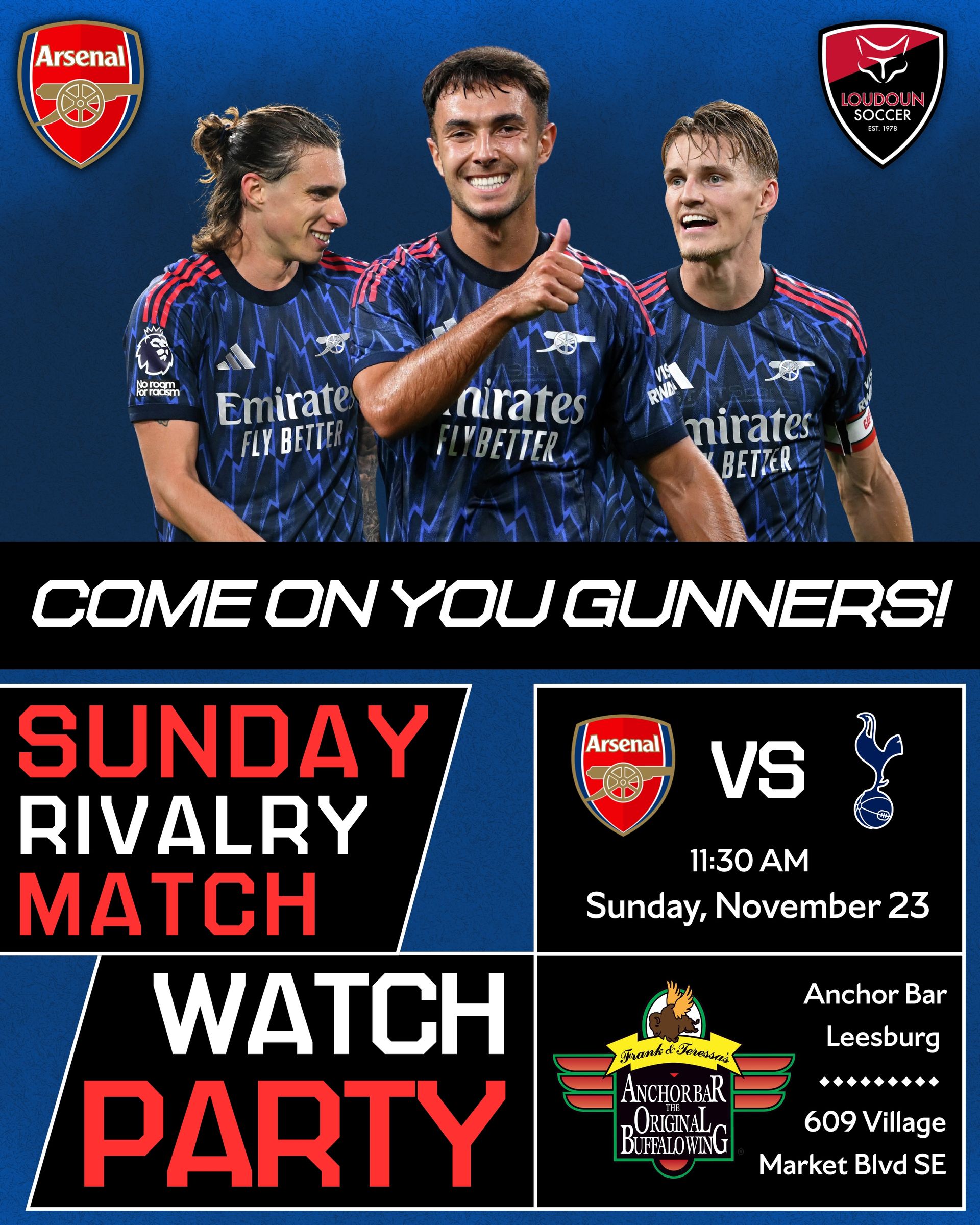 Join us for the North London Derby at Anchor Bar Leesburg as rival Tottenham Hotspur meet Arsenal at Emirates Stadium.